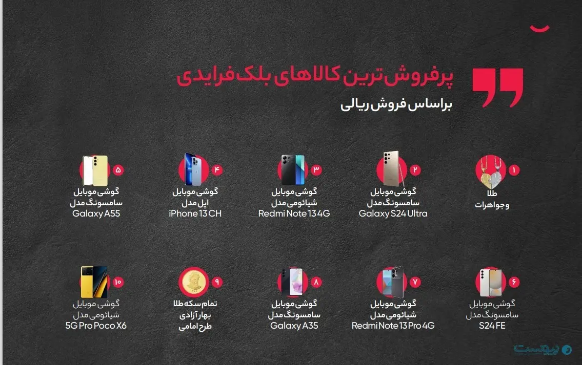 در جریان کمپین بلک فرایدی دیجیکالا، طلا و جواهرات و انواع گوشیهای موبایل مثل مدلهای پرچمداران سامسونگ و آیفون و شیائومی به عنوان پرفروشترین اقلام از نظر ارزش ریالی شناخته شدند. گوشیهای موبایل مانند آیفون و مدلهای سامسونگ که در دسته محصولات پرفروش دیجیکالا قرار گرفتند.