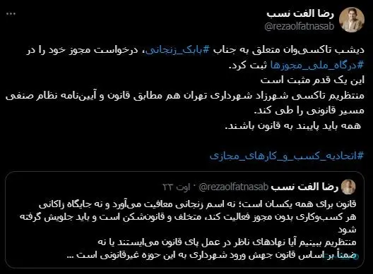 بعدتر او در صفحه شخصی خود خبر داد که داتوان درخواست مجوز خود را در درگاه ملی مجوزها ثبت کرد. الفتنسب این اقدام را یک قدم مثبت دانست و گفت که منتظریم تاکسی شهرزاد شهرداری تهران هم مطابق قانون و آییننامه نظام صنفی مسیر قانونی را طی کند. قانون برای همه یکسان است؛ نه اسم زنجانی معافیت میآورد و نه جایگاه زاکانی.