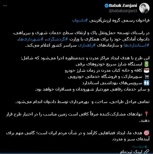 به گزارش پیوست، بابک زنجانی به تازگی طی فراخوانی اعلام کرده است که گروه داتوان آمادگی دارد با وزارت گردشگری، شهرداریها، استانداریها و سازمانهای راهداری در این پروژه همکاری کند. او در توییتی نوشته است: این طرح با هدف ایجاد مراکز مدرن و چندمنظوره اجرا میشود که شامل ایستگاه شارژ سریع خودروهای برقی، کافه و خانه کتاب مدرن در زمان شارژ خودرو، سوپرمارکت و فروشگاه خدماتی خودرویی، سرویسهای بهداشتی استاندارد و سایر خدمات رفاهی موردنیاز شهروندان و مسافران است.