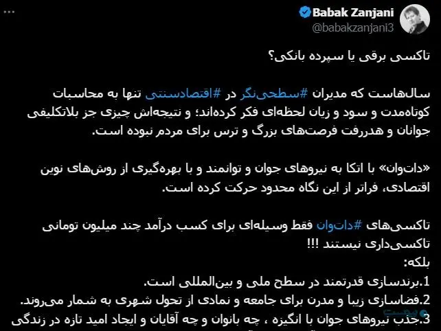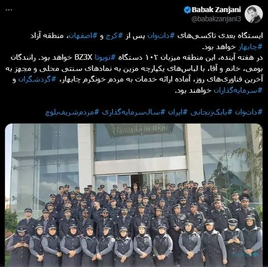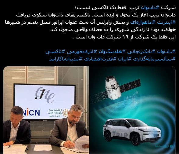 زنجانی در توییتهایش از چشماندازی روشن سخن گفته؛ تاکسیهای برقی با فناوریهای نوین، رانندگان محلی با لباسهای سنتی، سکویی برای اینترنت نسل پنجم و برندی ملی. این تصویر بهویژه در مناطقی مانند چابهار جذاب است. اما کارشناسان میگویند که واردات خودرو بدون مجوز فعالیت، ریسک بالایی دارد. همچنین اینترنت ماهوارهای نیازمند مجوزهای متعدد و حساسیتهای امنیتی است. اکنون داتوان در گام ثبت درخواست مجوز قرار دارد. این یعنی فعالیت رسمی آن هنوز قطعی نشده است. در عین حال، وعدههای بزرگ بابک زنجانی درباره اینترنت ماهوارهای و تحول شهری با محدودیتهای قانونی و هشدارهای نهادهای ناظر روبهروست.