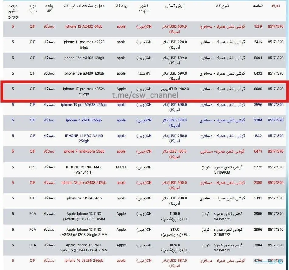 طبق لیست ارزشگذاری گمرکی TSC سامانه پنجره واحد تجارت فرامرزی، اولین آیفون ۱۷ با مشخصات Iphone ۱۷ pro max a۳۵۲۶ ،۵۱۲gb جهت اظهار مسافری در فرآیند رجیستری در سامانه گمرک قرار گرفت.