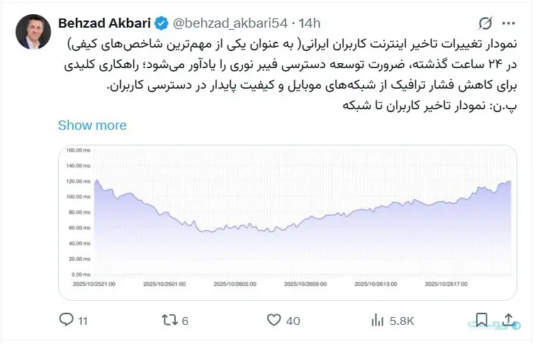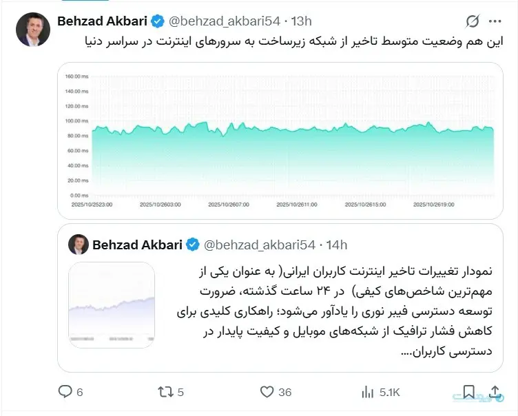 بهزاد اکبری، رئیس هیات مدیره و مدیرعامل شرکت ارتباطات زیرساخت، با انتشار دو نمودار در حساب کاربری خود در شبکه اجتماعی ایکس تغییرات تاخیر اینترنت کاربران در ایران طی ۲۴ ساعت گذشته را منتشر کرد.