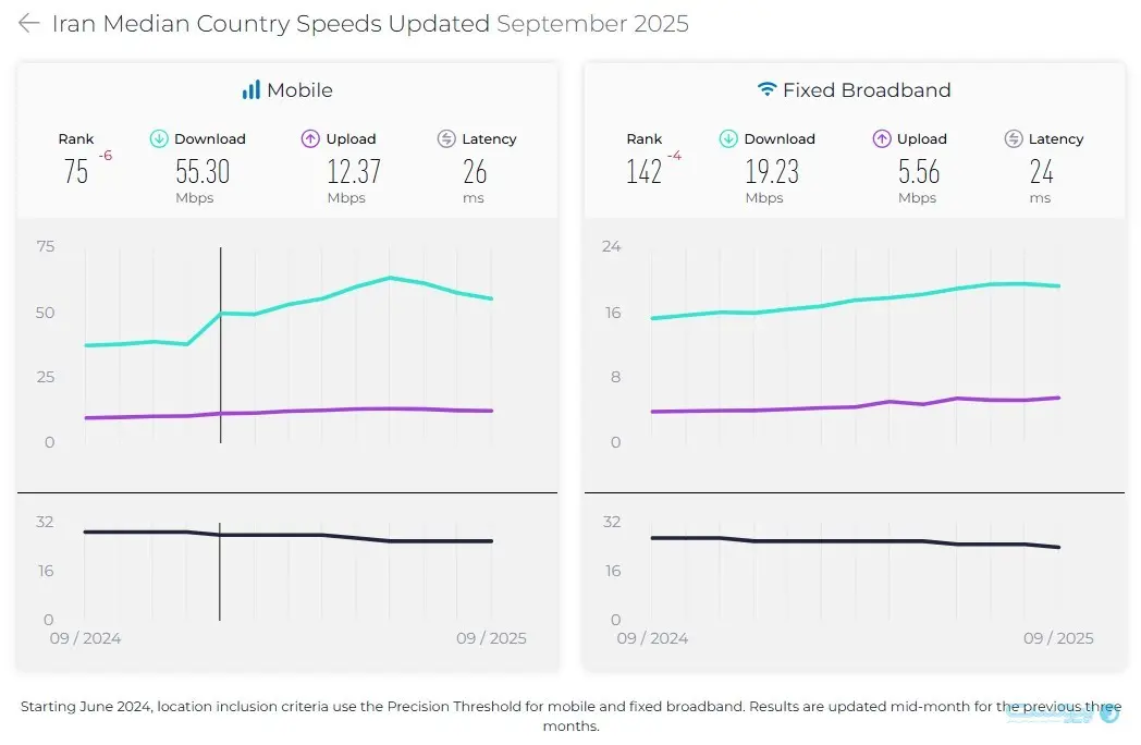 بر اساس دادههای منتشرشده در Speedtest Global Index برای اکتبر ۲۰۲۵، متوسط تاخیر ثبتشده در تستهای استاندارد برای کاربران ایرانی نشان میدهد که ایران از نظر کیفیت ارتباط موبایلی در رتبه ۷۳ میان ۱۵۴ کشور قرار دارد. در بخش اینترنت ثابت یا باند پهن نیز ایران در جایگاه ۱۱۵ قرار گرفته است. اگرچه اعداد مرتبط با کیفیت شبکه در ظاهر با استانداردهای قابل قبول جهانی فاصله زیادی ندارند و در فضای آزمایشگاهی یا در شرایط بدون اختلال، برای استفادههایی مانند مرور وب، پخش ویدئو یا ارتباطات سبک، قابل قبول به نظر میرسند؛ اما آنچه کاربران در تجربه روزمره خود احساس میکنند، تفاوت قابلتوجهی با این دادههای پایه دارد.